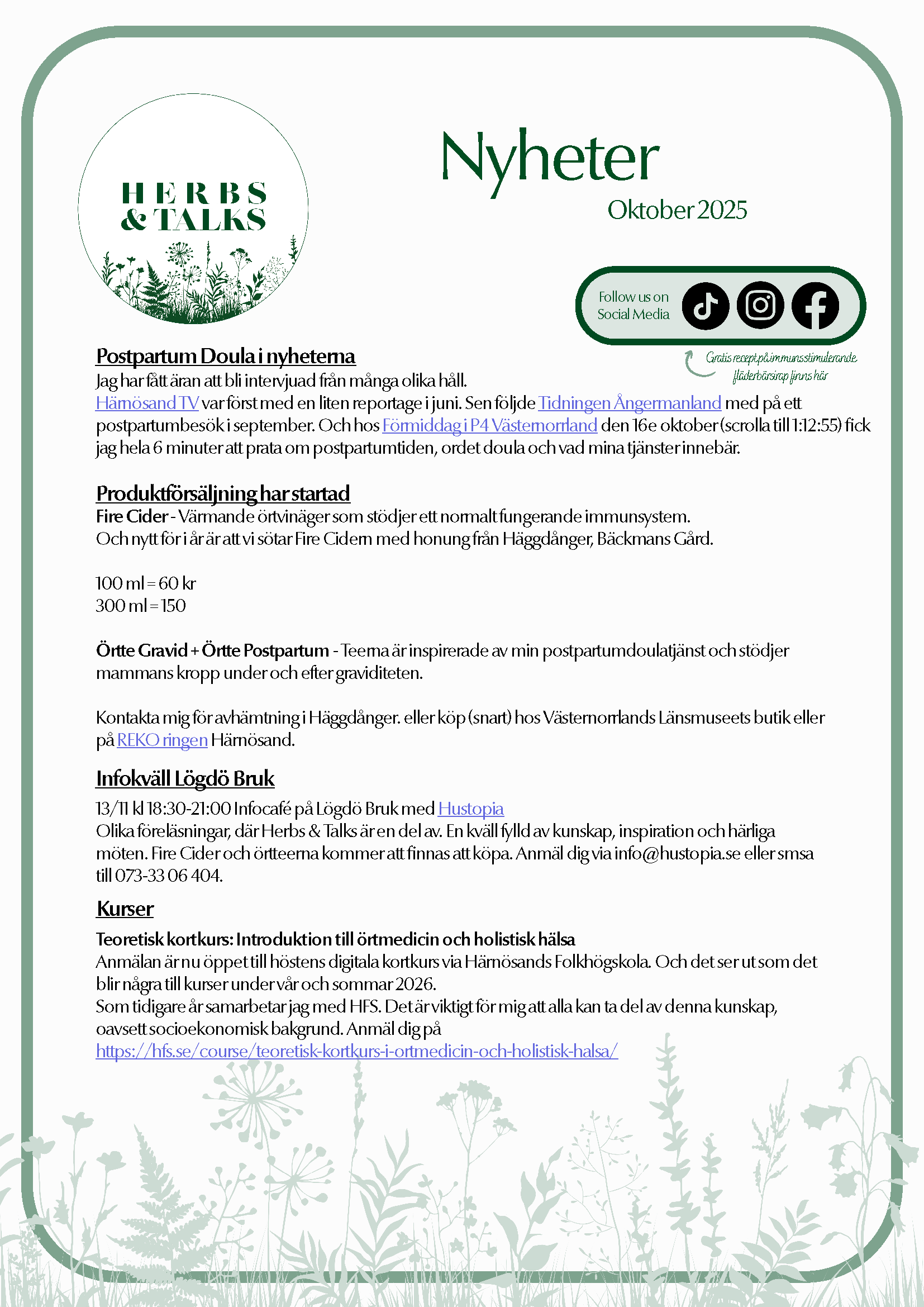 Herbs & Talks is a small company based in Häggdånger, Härnösand. The founder is Leila Verlinden. Leila works as a postpartum doula in Region Västernorrland, where she supports families during the often fragile and sensitive time after childbirth. Leila has studied herbal medicine for six years and has four certificates from three different education institutions all over the world (Belgium, the Netherlands and the USA). She has taken courses (and is continuously training), in orthomolecular medicine (Belgium) and has certificates in herbal medicine for pregnant women, leaky gut syndrome, and microbiome for children and pregnant women. On top of that she teaches courses in holistic health and herbal medicine, manufactures and sells Fire Cider and herbal teas. And during the green months she guides herbal walks with a focus on medicinal plants, in and around Härnösand. Leila’s passion is to provide practical information that is directly applicable in our daily lives.
